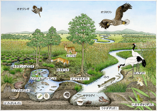 釧路湿原の食物連鎖を表すイラスト、生き物のトピック、写真を掲載しています。釧路湿原に様々な生き物が住んでいること、それらは食べる食べられるの関係で複雑につながりあっていることを、知ってもらうきっかけになればと考えています。