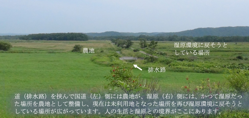 農地、湿原に戻りつつある未利用地、これから取り組みが行われる場所など、これらが隣接する人の生活と湿原との境界を感じることができる場所です。